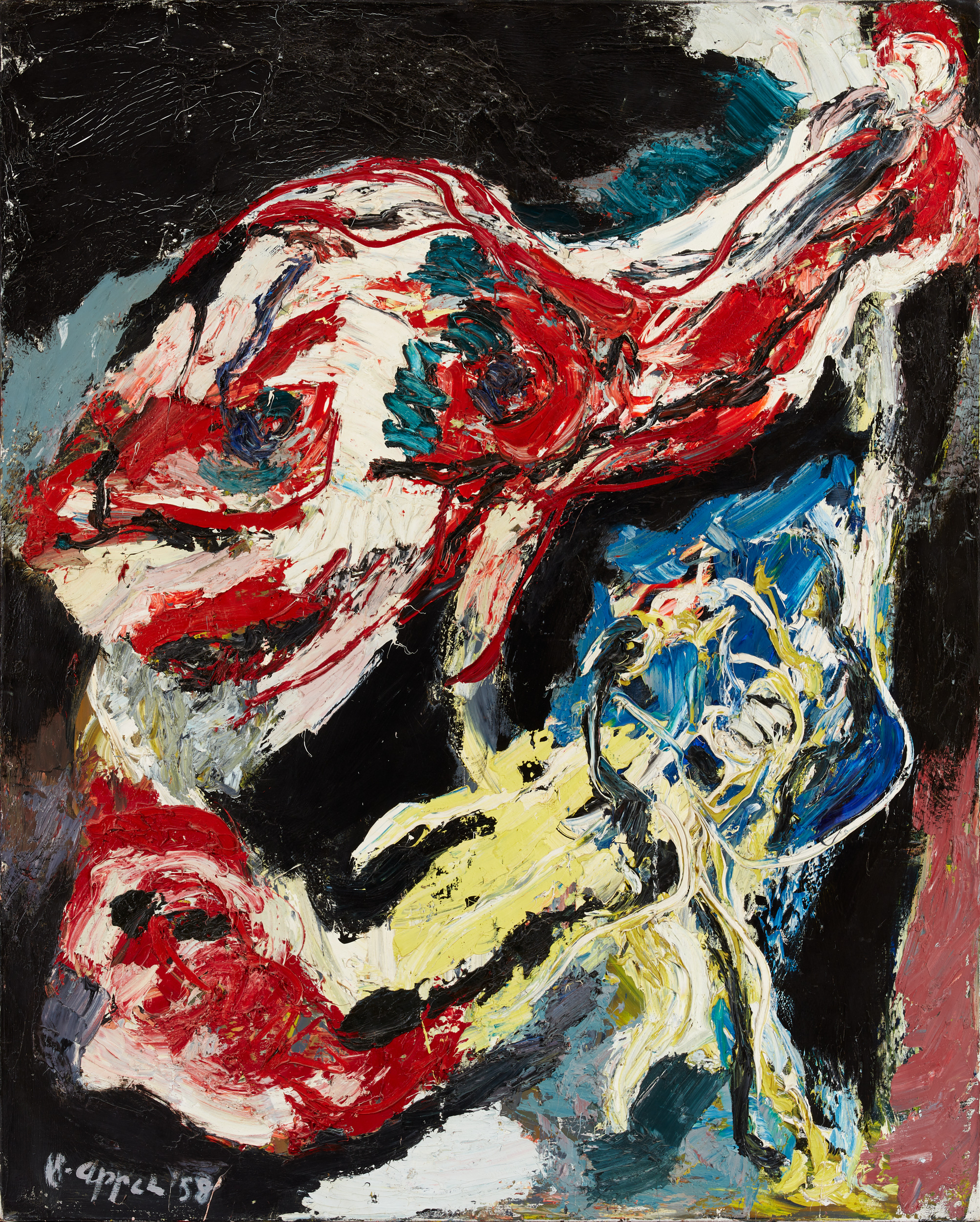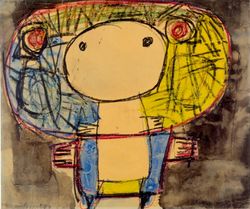 |  Download jpg Karel Appel. "Stort dyr fortærer lille dyr", 1958. Olie på lærred, 162 x 130 cm. Helle og Finn Poulsen samling. Foto: Ralf T. Søndergaard © Karel Appel Foundation / VISDA |  Download jpg Karel Appel. "Barn med blomster", 1947. Akvarel, kridt og tusch på papir, 38 x 45,8 cm. Stedelijk Museum Schiedam © Karel Appel Foundation / VISDA |