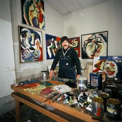 |  Download jpg Karel Appel i sit atalier på Château de Molesmes, 1967 © Nico Koster / MAI |  Download jpg Karel Appel med bemalet Fokker F-100 fly foran Twin Towers, New York 1983 © Nico Koster / MAI |
